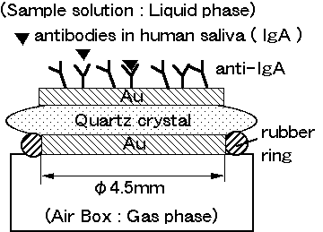 One side of quartz crystal was set on the O-ring sealed air box. On the other side of the quartz crystal for sample liquid, anti-IgA was immobilized.
