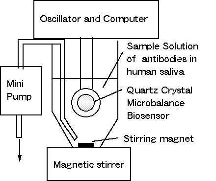 at 1000 sec as shown in figure 4. This frequency change showed almost equivalent to 1 micro g/ml of standard human IgA. This result indicated 100 micro g/ml quantities of this human saliva with quartz crystal microbalance biosensor as same as ELISA method. From this example, the antibodies in human