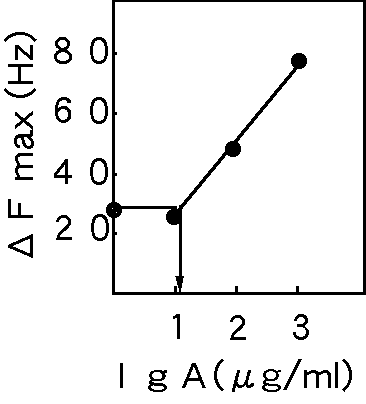 Immunoreaction between the immobilized anti-IgA and 100 times diluted human saliva ( IgA ) is monitored by the frequency change in real time. The maximum frequency change is detected in about 1000sec.